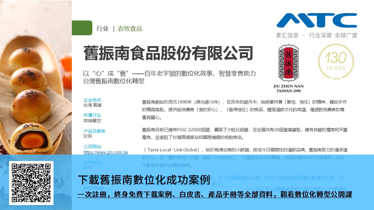 通過SAP和MTC的支撐,我們打造了“信任”,營造了“喜悅”,以數字實現了“傳承”。130歲的舊振南,依然會像壹個年輕人,融合新舊、以求創新,成為國際知名的漢餅品牌,讓所有海內外的消費者見識臺灣的味道與特色。