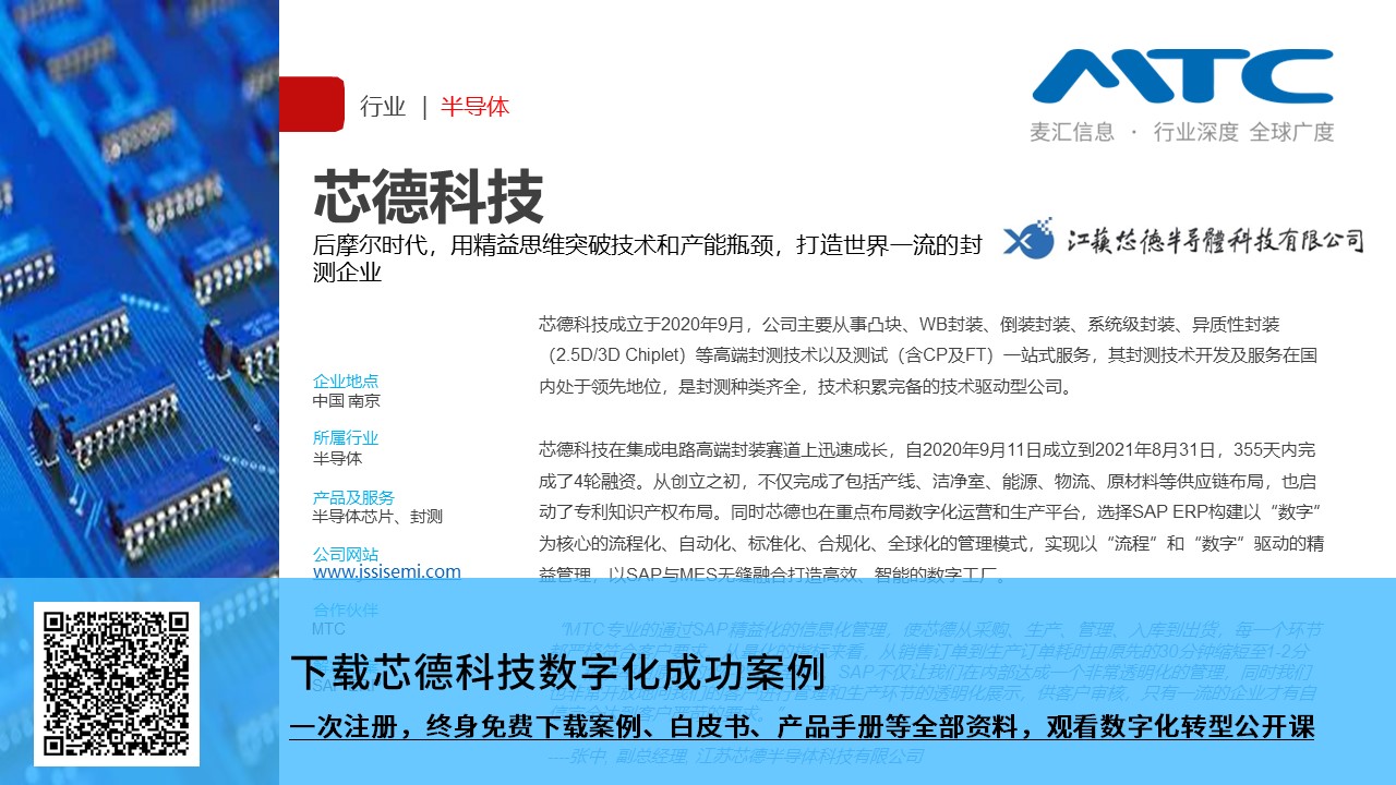 芯德科技在集成电路高端封装赛道上迅速成长,自2020年9月11日成立到2021年8月31日,355天内完成了4轮融资。从创立之初,不仅完成了包括产线、洁净室、能源、物流、原材料等供应链布局,也启动了专利知识产权布局。同时芯德也在重点布局数字化运营和生产平台,选择SAP ERP构建以“数字”为核心的流程化、自动化、标准化、合规化、全球化的管理模式,实现以“流程”和“数字”驱动的精益管理,以SAP与MES无缝融合打造高效、智能的数字工厂。