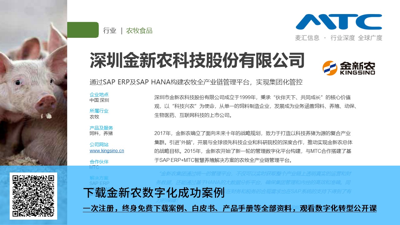 2017年,金新农确立了面向未来十年的战略规划,致力于打造以科技养猪为源的复合产业集群。引进“外脑”,开展与全球领先科技企业和科研院校的深度合作,推动实现金新农总体的战略目标。早在2015年,金新农就与麦汇信息MTC合作,成功上马了SAP成长型企业ERP系统(SAP Business One on HANA)和MTC智慧猪场管理系统,打通了农牧全产业链的数字化管控平台。