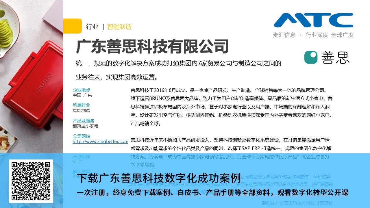 善思科技近年来不断加大产品研发投入,坚持科技创新及数字化系统建设,在打造更能满足用户情感需求及功能需求的个性化品类及产品的同时,选择了SAP ERP打造统一、规范的集团化数字化解决方案,为实现“成为中国高端小家电领导者品牌、为全球千万家庭提供优质产品”的企业愿景打下坚实基础。