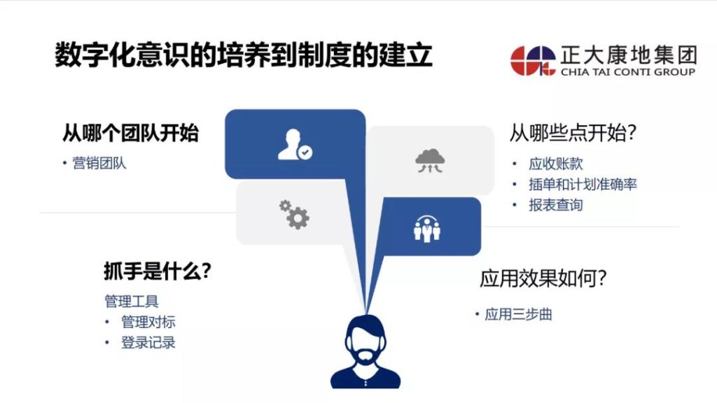 最后决定从营销环节开始抓,在企业流程中营销团队的流程居于最起点,只有销售计划做准确了,产能才会好,销售团队也是最难管理的,他们直面客户,人又多,非常难管理,其他部门无非就是两种角色:一种是真正录单的人员,他们每天都在系统里使用,只要要求他做到日清日结就好了;另外一种是中级领导干部,他如果不看报表,不分析数据,晒两次名单就解决了。所以最难的就是营销团队。