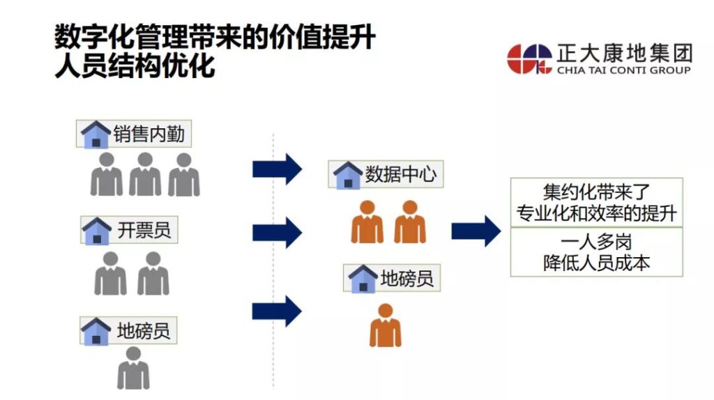 在ERP上线之前,我们所有的订单全部是销售内勤在开单。ERP上线之后,我们有一套新的手机订单系统,业务员开始自己下单,这直接导致了销售内勤减员一半。我们把这一半人员分为两个组:一个是数据中心组,10人左右,负责整个集团所有营销团队的客户主数据、合同、定价等等这些数据的管理工作;一个是协调组,当销售人员和生产之间发生问题的时候,由他们进行协调。