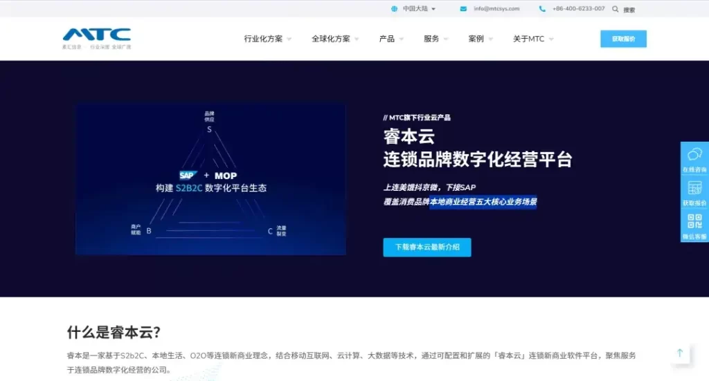 MTC自主产品页面展示了MTC基于深厚行业经验打造的创新产品,即MTC智慧农场、睿本云新零售、麦汇企业AI助手,您可以通过这些页面了解MTC如何将SAP技术与行业专业知识深度融合,为特定领域客户提供量身定制的数字化解决方案。