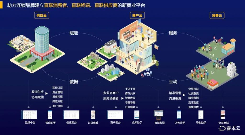 睿本云之前以做行业大中型品牌客户为主,未来将更多服务于中小型连锁品牌。客单价从过去百万级,降低到十万级门槛,帮助中小型连锁品牌客户完成线上线下数字化转型升级。睿本云现有品牌客户200+,链接近20万家门店。