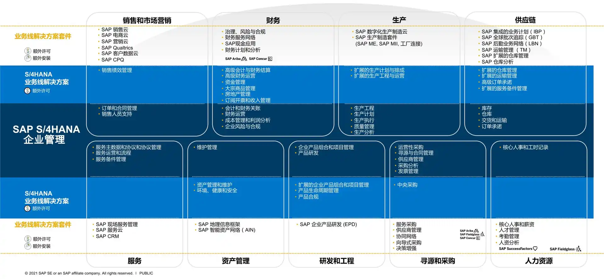 1.  覆盖核心业务线的功能(深蓝色部分),包括销售和市场营销、财务、生产、供应链、服务、资产管理、研发和工程、寻源和采购、人力资源。