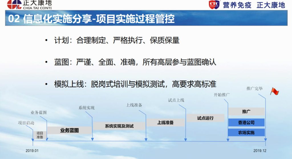 在项目规划时,首先要考虑对外部供应商的选评。农牧行业想要运作ERP或者养殖软件,一定要考虑有丰富行业经验的供应商。其次是内部,对系统的要求要来源于业务并且围绕业务,那正大康地在整个SAP的落地过程中进行了需求梳理和需求确认。同时,甄选关键用户团队,一是要聪明;第二个是效率高;第三个要有思考能力。最后就是一把手工程全员参与,将一把手的管理理念传达给集团的所有高层。